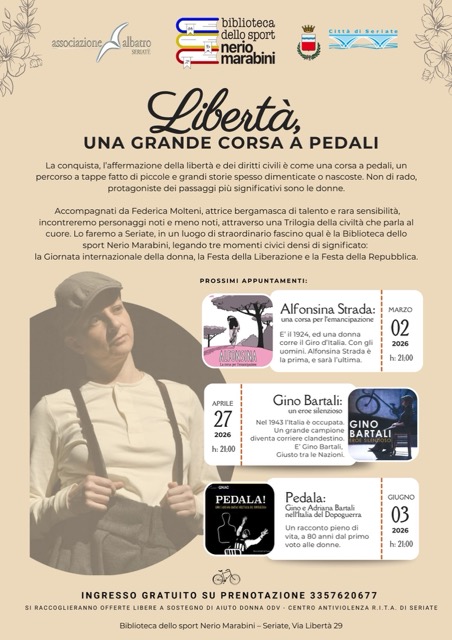 Accompagnati da Federica Molteni, attrice bergamasca di talento e rara sensibilità, oltre a Gino Bartali, incontreremo personaggi noti e meno noti, attraverso questo spettacolo teatrale che parla al cuore.